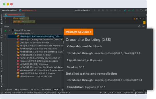 Snyk is a developer security platform. Integrating directly into development tools, workflows, and automation pipelines, Snyk makes it easy for teams to find, prioritize, and fix security vulnerabilities in code, dependencies, containers, and infrastructure as code. Supported by industry-leading application and security intelligence, Snyk puts security expertise in any developer’s toolkit.