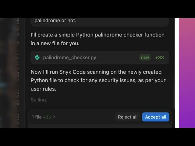 Durch diese Regel belässt es der KI-Assistent nicht beim ursprünglichen Output, sondern scannt die generierte Funktion sofort mit Snyk Code. Die zugrunde liegende Engine von Snyk erkennt die IDOR-Schwachstelle auf Anhieb und liefert dabei auch den nötigen Kontext. Damit behebt der KI-Assistent die Schwachstelle nun autonom, indem er die entscheidende Logik zum Abgleich der ownerId der Patientenakte mit der userId der authentifizierten User-Session hinzufügt. Nach Ausführung eines erneuten Scans dieses Codes erhält er die Bestätigung von Snyk, dass die Schwachstelle nun behoben ist.